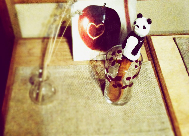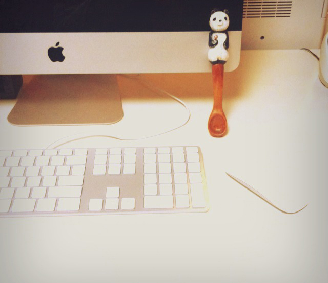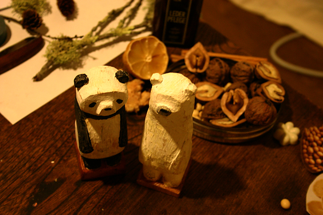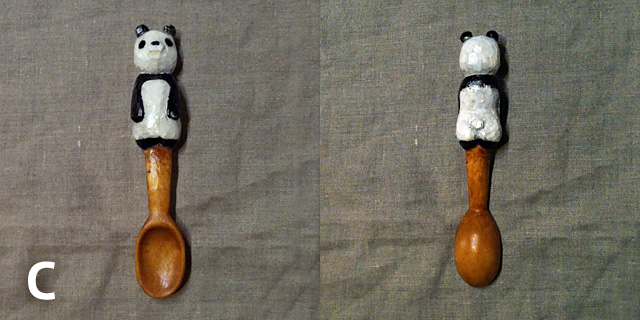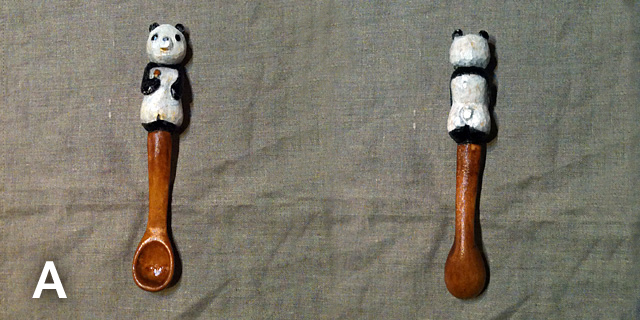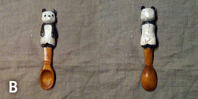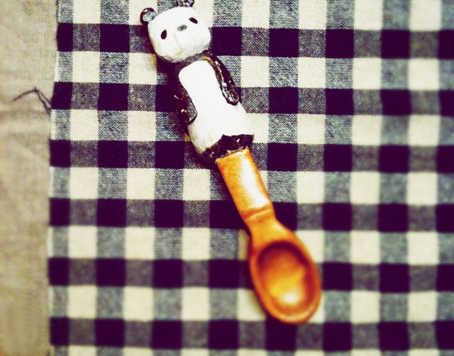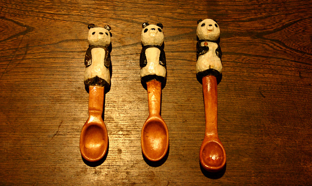 あまりにもかわいいこのパンダたちを眺めていてふと考えたのが、「このパンダが彫ってある木のスプーン、絶対かわいいよね」ということです。うーん、間違いない、かわいい、見たい、てゆうか欲しい。そこで駄目モトで斎藤さんにお願いしてみたところ、まさかの「うん、いいよ」とのお返事が!というわけで早速制作にはいっていただき、出来上がったのがこの三本です。
