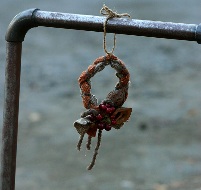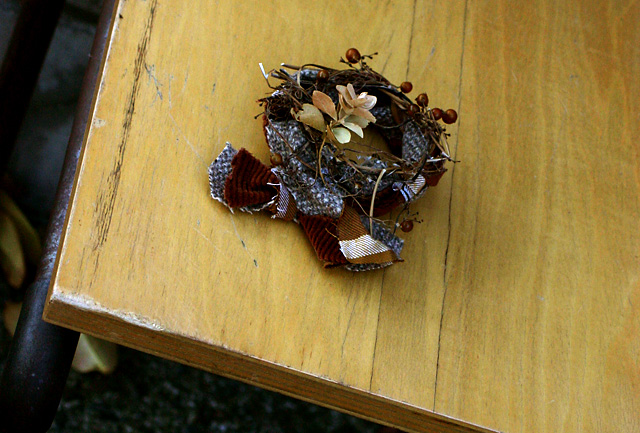 それでも、残っていたいい風合いの布と枝で作ってみました、リース。