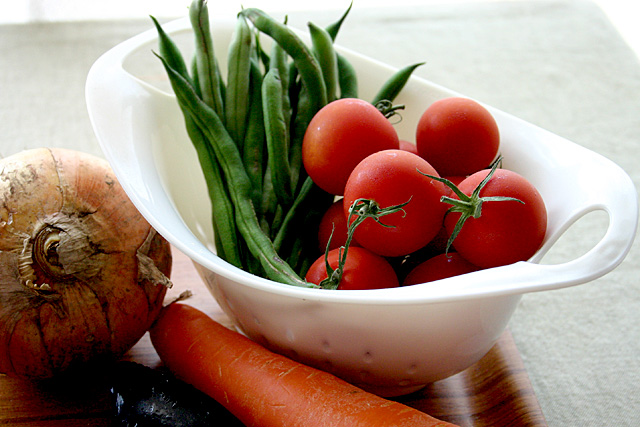 9.ナスを切り、トマトといんげんと素揚げします